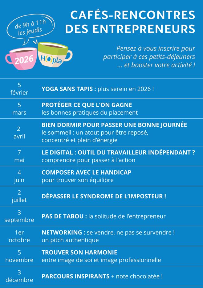 Venez participer à un moment convivial, autour d’un café Vous y rencontrerez d’autres entrepreneurs, tout en échangeant autour d’un thème lié directement à l’organisation de votre activité. Les cafés-rencontres sont ouverts aux entrepreneurs immatriculés et aux porteurs de projets proches de l’immatriculation. Ils sont animés par des experts du thème abordé.